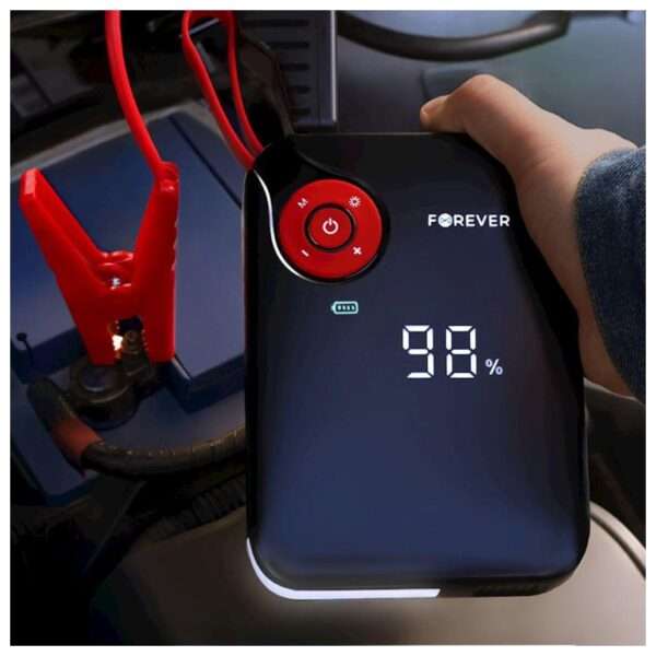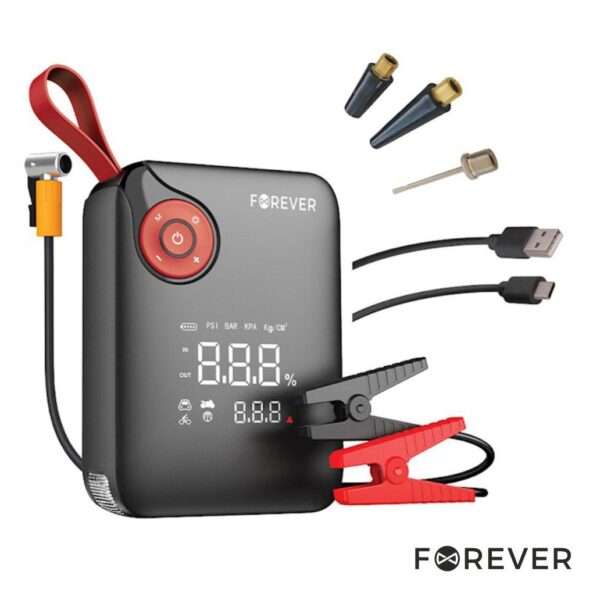 O arrancador de baterias Forever JS-400 é um dispositivo compacto 4 em 1 com capacidade de 7200 mAh, ideal para situações de emergência na estrada. Com uma corrente de arranque até 600A, permite arrancar rapidamente veículos com bateria descarregada. Integra ainda um compressor de ar com pressão máxima de 150 PSI, ideal para pneus ou equipamentos insufláveis, e uma lanterna LED incorporada para iluminação em condições de fraca visibilidade.