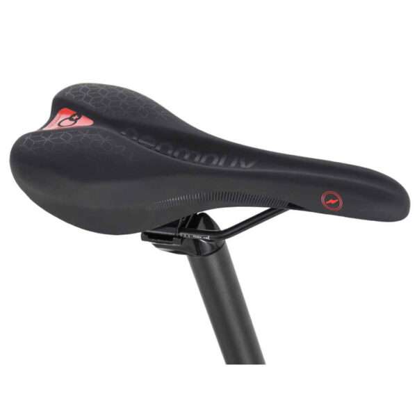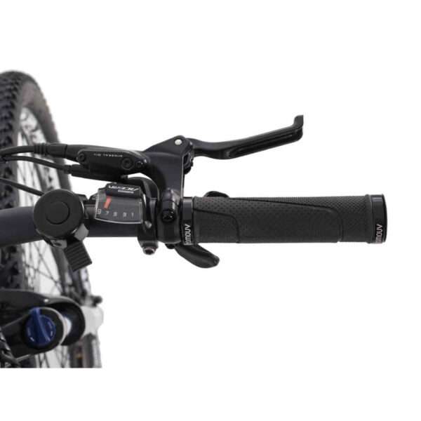 Uma confortável bicicleta de montanha semi-rígida com motor traseiro e discos hidráulicos, ideal para aventuras em trilhos mais acidentados.