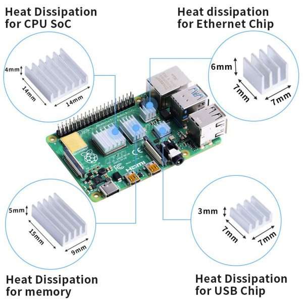 - 1x Dissipador pequeno: 6 x 6 x 5mm para chip de Ethernet